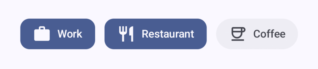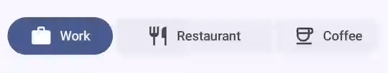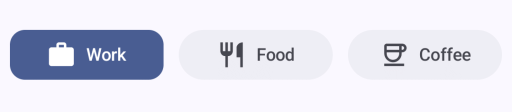 Here we’re managing the selected state using selectedIndex and updating it whenever a button’s checked state changes. The toggleableItem() function can be used to declare a child item of the group that is represented by a toggled state – this allows our button group to become a row of selectable items, with the currently selected item clearly styled. This function will handle thethe visual feedback and animations for us when it comes to this toggled state, using the checked and onCheckedChange arguments to handle this.